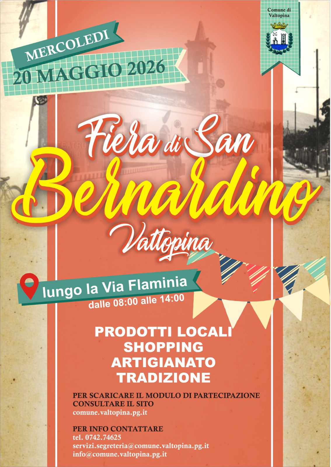 Il Comune di Valtopina invita cittadini e visitatori alla Fiera di San Bernardino, in programma mercoledì 20 maggio 2026 lungo la Via Flaminia.
